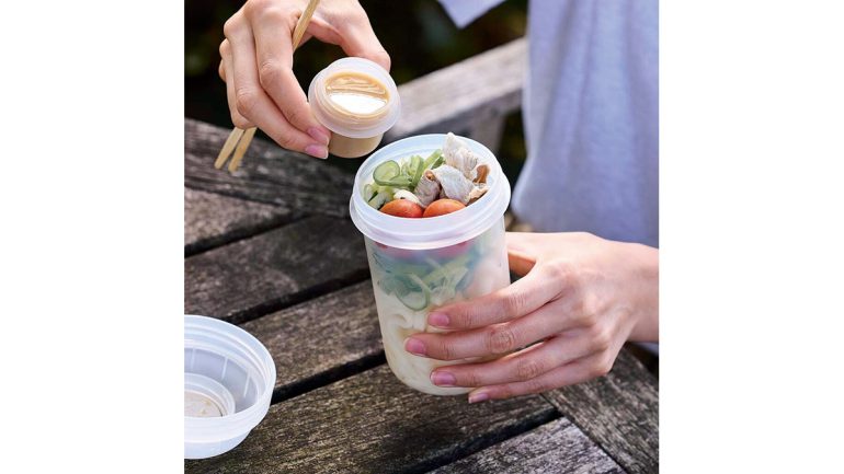本体のふたの内側に、ドレッシングやうどんのタレ・出汁などの入るトッピングカップが付いた縦型ランチボックス。「今までにない形状と、サラダや麺類を持ち運ぶという体験の提供に加え、電子レンジ対応を可能にした機能面も好調の要因と考えています」(広報部)。当初計画の2.5倍以上が売れ、一部店舗を除き、発売後1か月で品切れが発生した。